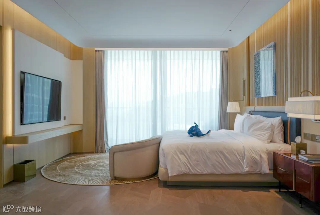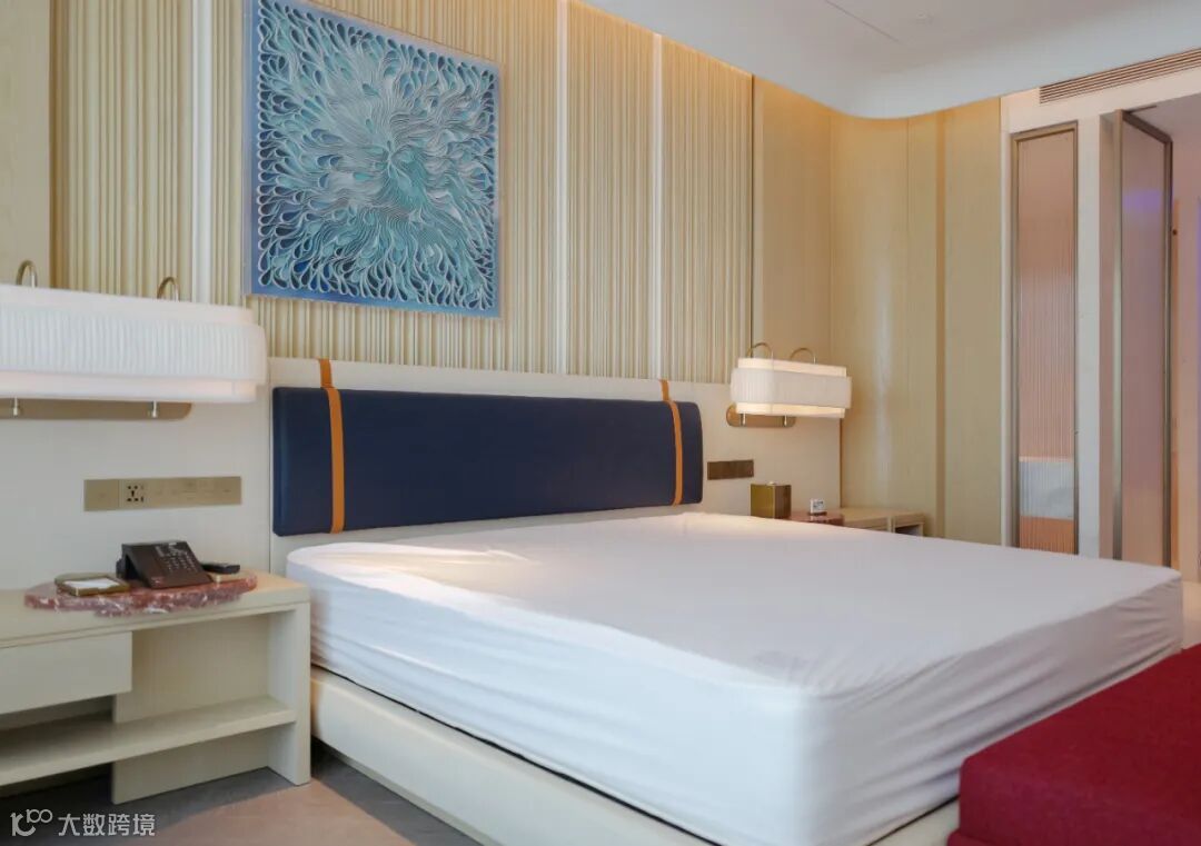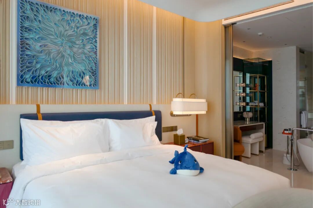 全海景大床房整个空间主要以原木色系为主,呈波浪木条纹及弧形的墙面装饰搭配大面积白色电视背景,代表海洋元素的蓝色迷你吧及装饰画,宽大舒适的大床,柔和的灯光,显得非常有质感,圆形的浴缸、白色大理石洗漱台、步入式衣橱,让整体感觉奢华而又温馨。