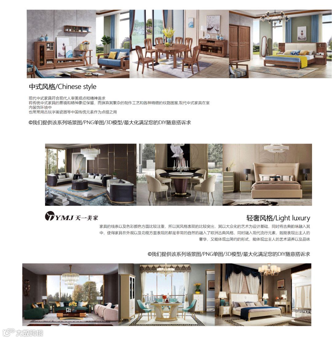 产品风格涵盖现代极简、轻奢、后现代、简欧、简美、欧式、美式、新古典、中式、新中式;
