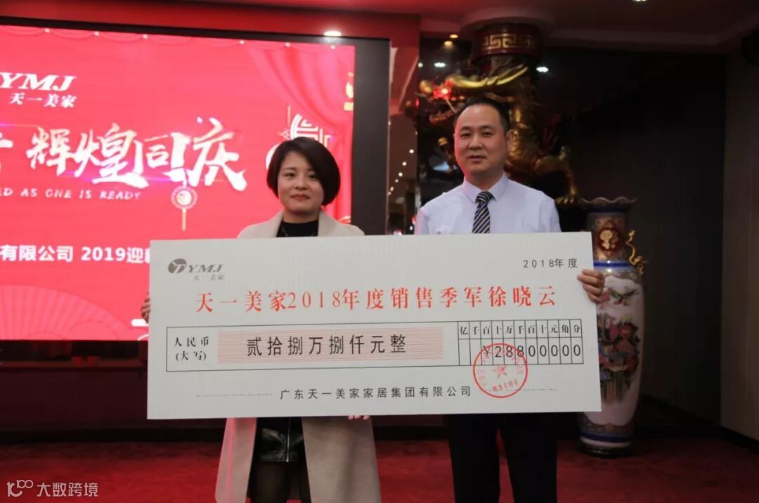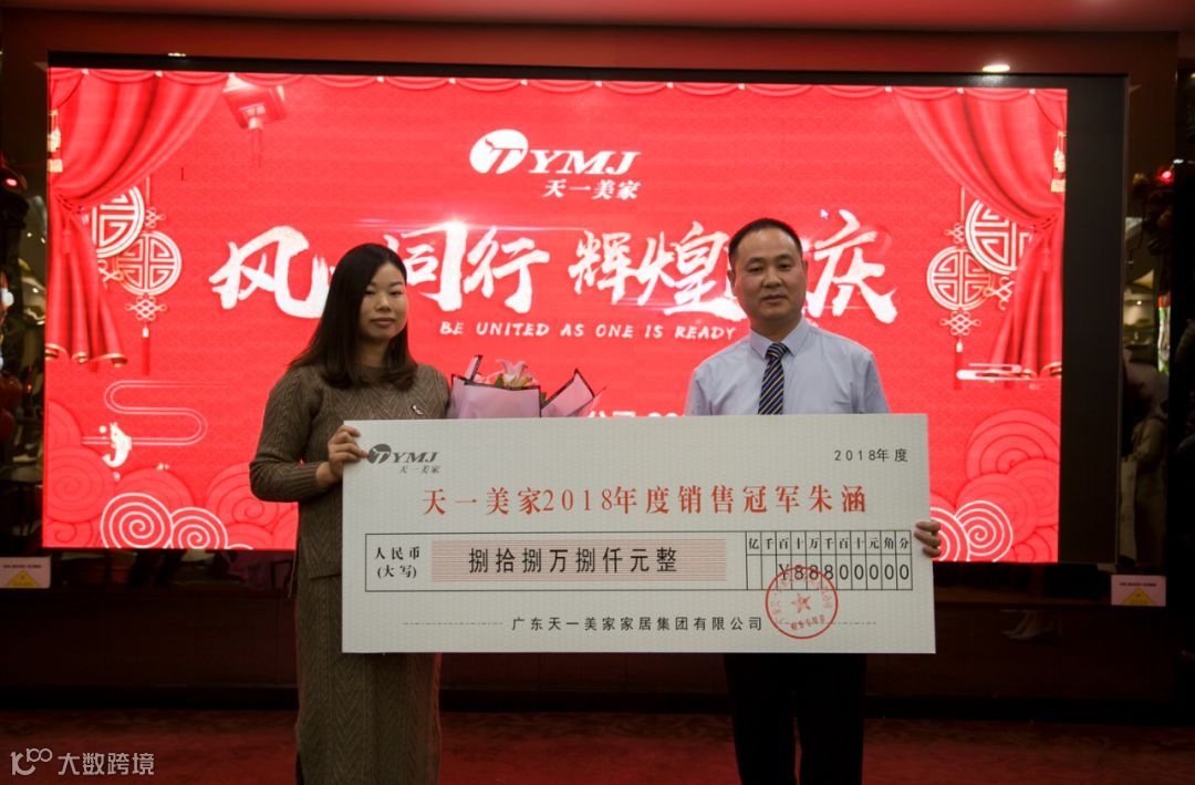 第八环节,终于迎来了本次年会的重头戏,由天一美家董事长程一先生一一为2018年度销售冠军、亚军及季军颁发了冠军88.8万、亚军38.8万及季军28.8万的奖金支票。