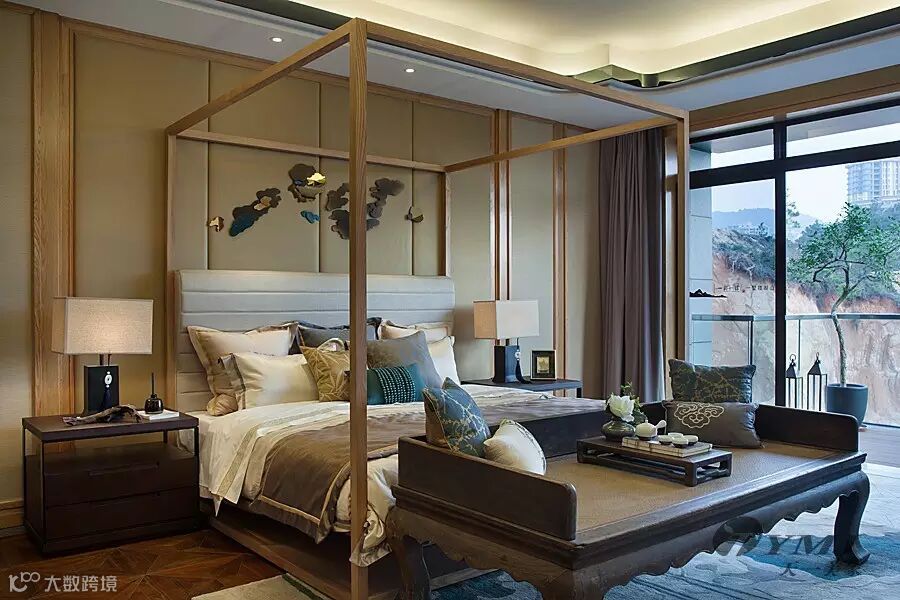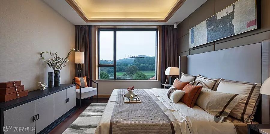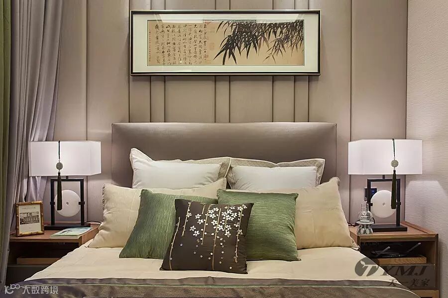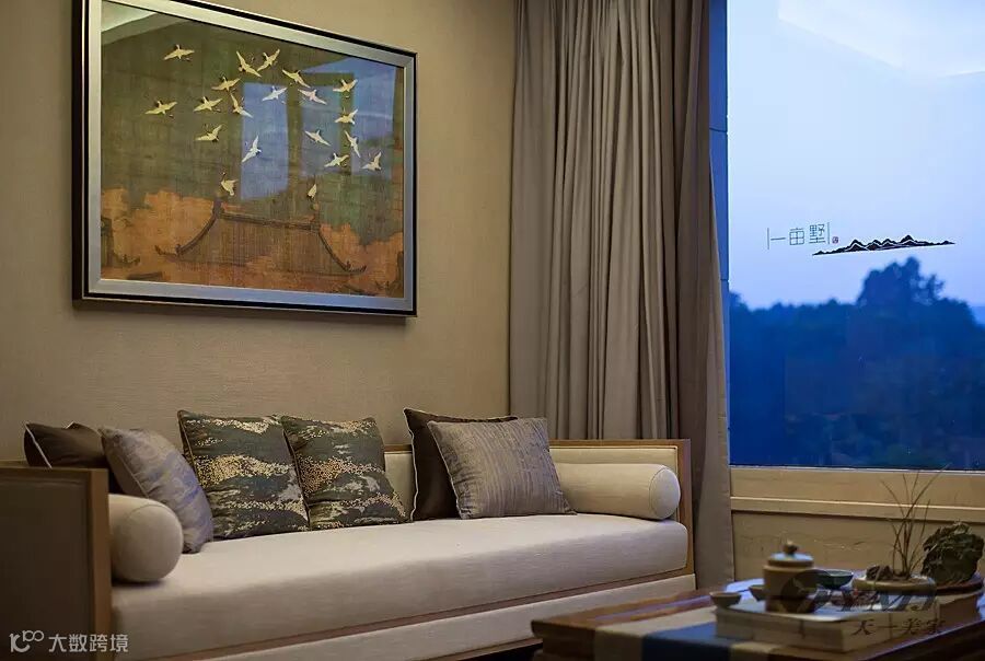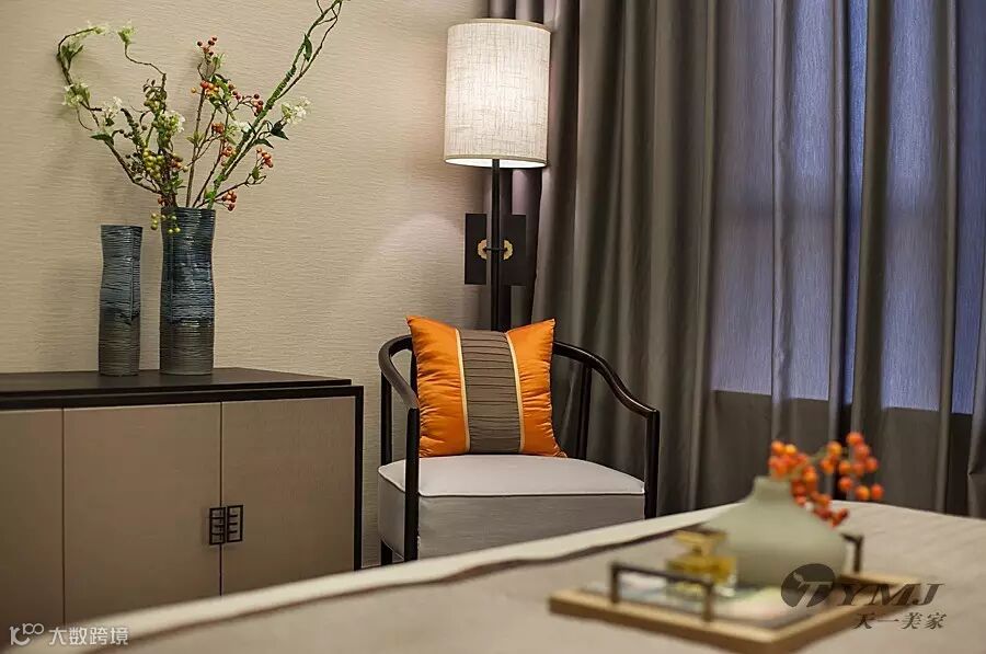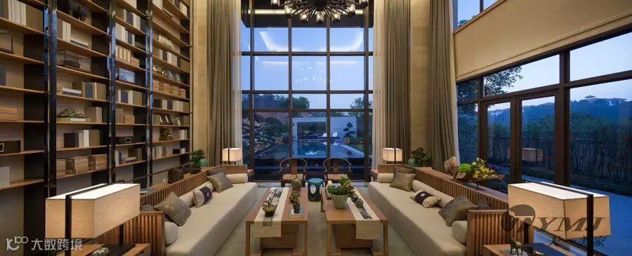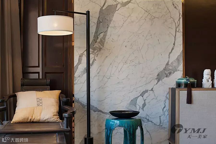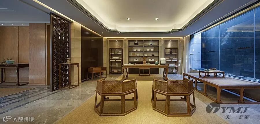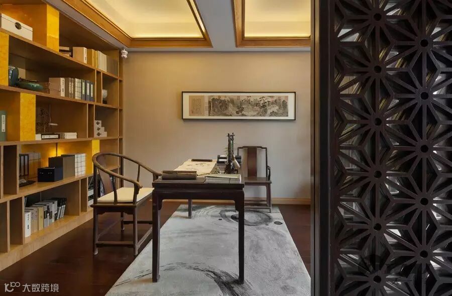 东方美学讲究对称,客厅家具的对称摆法让空旷的客厅空间形成较好的围合感,高耸书柜里的书籍、工艺品的陈列既彰显又吻合空间主人对国学文化热衷且造诣深厚的人物定位,结合灰蓝调水墨韵的地毯、空间的青绿色调的饰物,目的指向东方情调的营造。