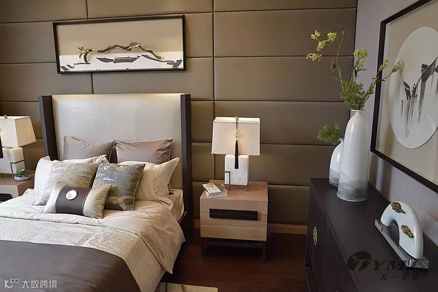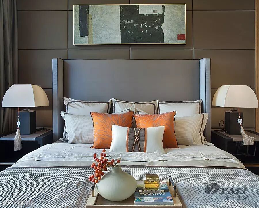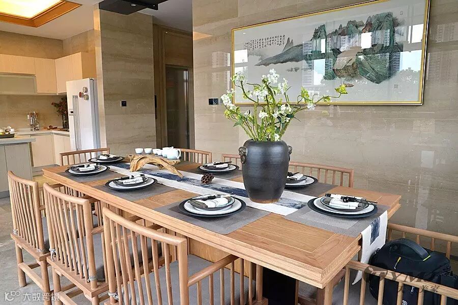 墙壁悬挂高仿真艺术品《兰亭序》山水画、行草书法长卷,再现宋元时期的审美意趣,时光交叠亦是美景;地面铺设的是水墨韵的地毯,一山一水,一书一画,尽显端雅之态;文房四宝—笔墨纸砚都是中式风格元素的体现。