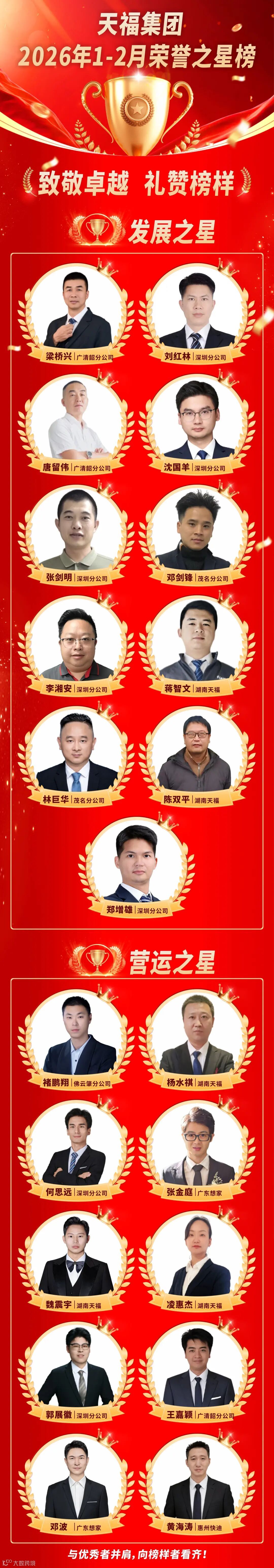经过1-2月的不懈努力,2026年首批天福人凭借踏实的工作作风与优异的工作成绩登上荣誉之星榜单,成为全体天福人学习的榜样。