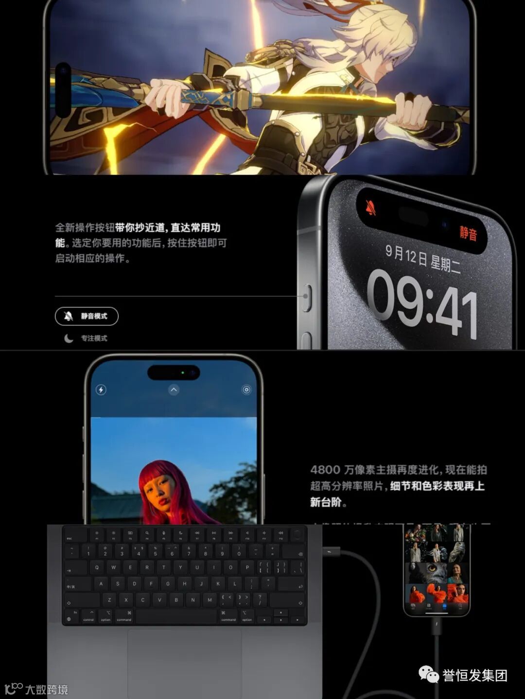 接下来是iPhone15系列,首先是灵动岛会以醒目方式弹出提醒和时实活动。设计上打造出颜色与材质通体融合的玻璃背板,经久耐用,抗水防尘。全新4800万像素主摄上位,最高4倍分辨率拍下满满的细节,2倍长焦功能堪比第三个摄像功能。续航从早到晚,A16仿生芯片,Pro级实力认证,USB-C众口一致,个性秀换名片等等。