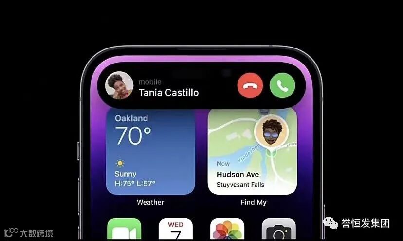 首先14Pro和Max迎来了重大更新,沿用多年的刘海摇身一边为长条形的药丸设计,除了面积小了百分之三十更重点在于,根据不同App这个药丸在软件层面,可以自由变换,比如面部解锁,导航,音乐播放,苹果将其命名为“灵动岛”这动画非常丝滑。