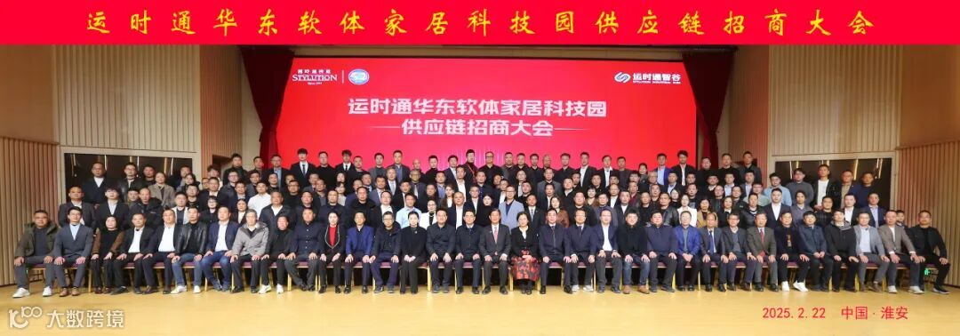 2025年2月22日,运时通华东软体家居科技园供应链招商大会在江苏淮安萧湖国际大酒店盛大举行。淮安区委书记颜复、淮安市台办主任周海滨,淮安区委副书记、淮安区人民政府区长邓萌,淮安市台商服务中心主任程伟,淮安区委副书记、省委驻区帮促工作队队长余灏,淮安区委常委、统战部部长钟马等政府领导,运时通控股集团董事长陈燕木、副董事长黄喜贞等集团高管以及运时通供应链合作伙伴等230余位企业领导嘉宾齐聚一堂,共襄盛举。