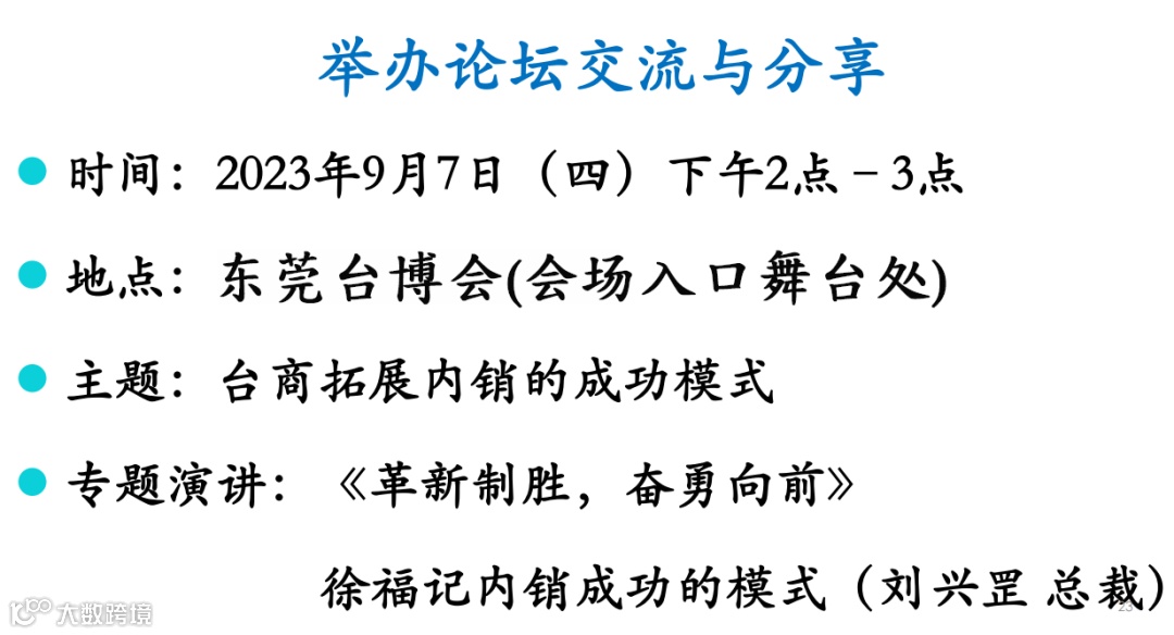 内拓会展览将在9月7日于东莞台博会B04展位举行,作为内销拓展的新起点。这是一个难得的机会,为台商们提供了展示和分享他们的内销成功经验的平台。论坛交流与分享活动将于当天下午2点至3点在东莞台博会(会场入口舞台处)举行。