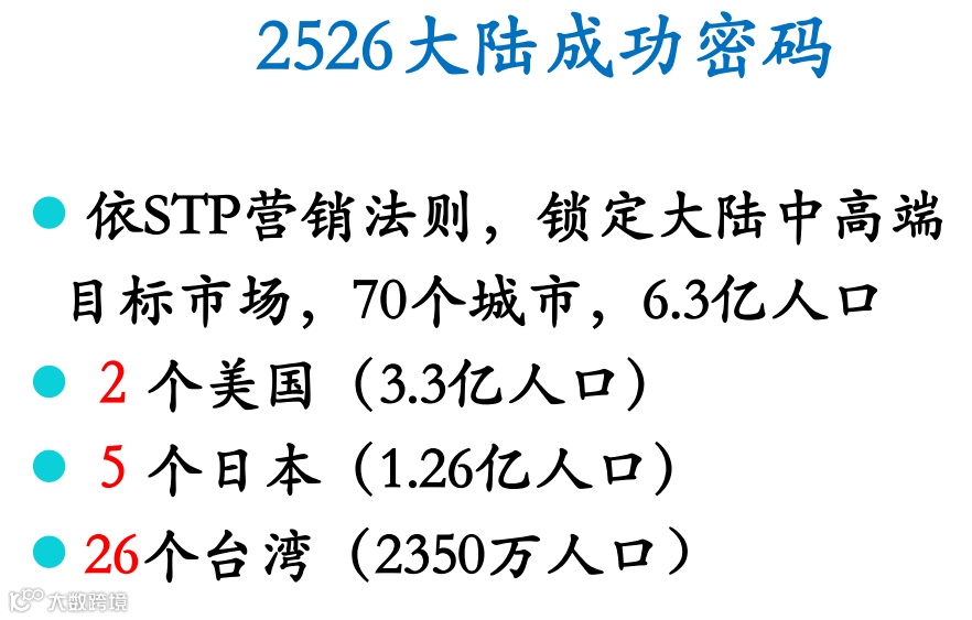 在内拓会,陈燕木主委提出了“2526大陆成功密码”,作为成功的路径指南。根据STP营销法则,陈主委精准地锁定了大陆中高端市场,这个市场庞大无比,覆盖了70个城市,总人口高达6.3亿,相当于2个美国、5个日本,以及26个台湾的市场规模。