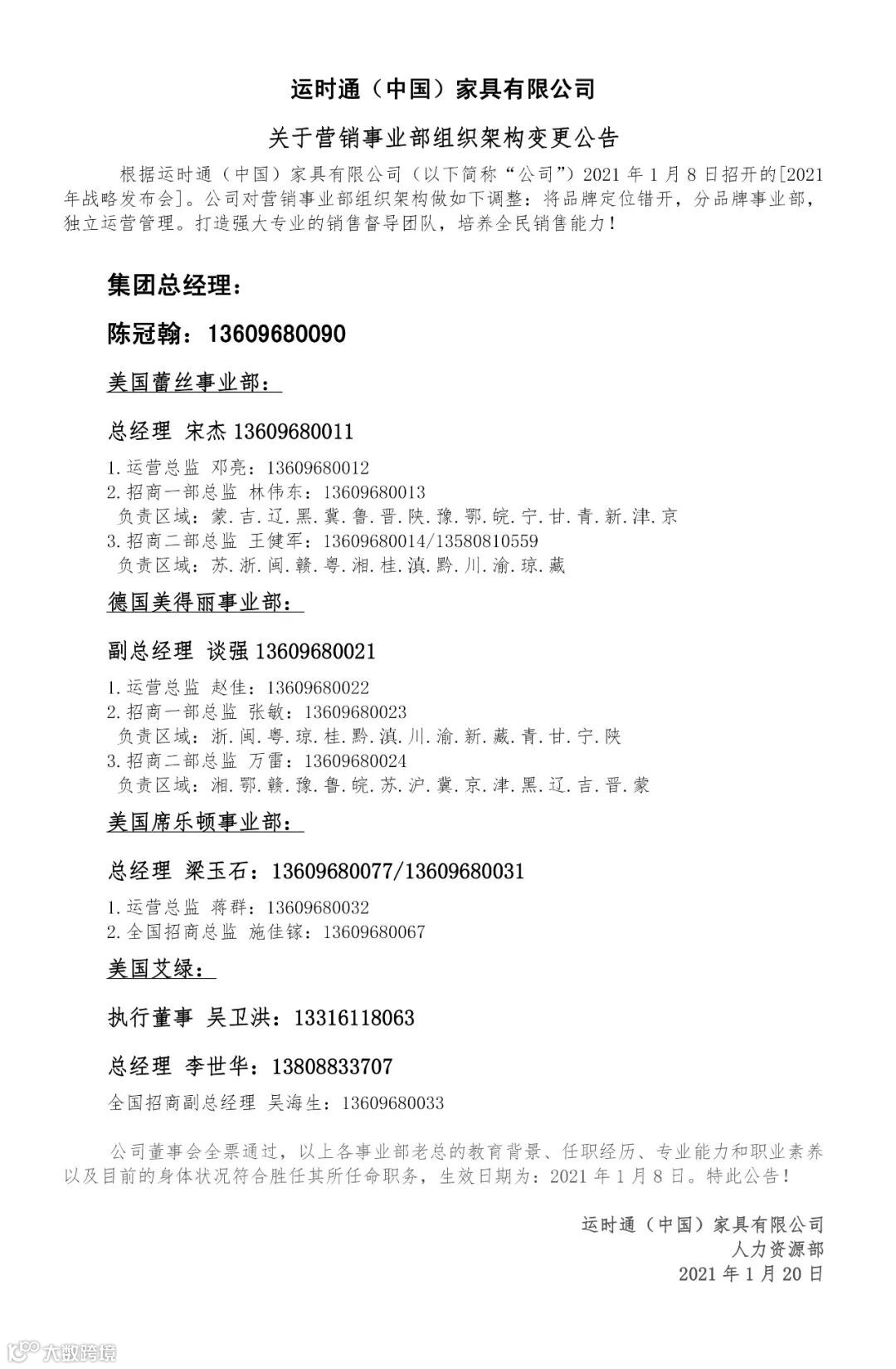 关于运时通控股集团营销事业部组织架构变更公告