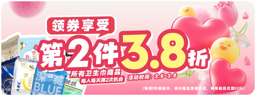 3月6日-8日活动期间,成为会员到店海量卫生巾领券享第2件3.8折。天福始终关注每位消费者的生活品质与情感需求,希望借此机会,通过节日促销活动让每一位女性在忙碌的生活中感受到被宠爱的幸福。