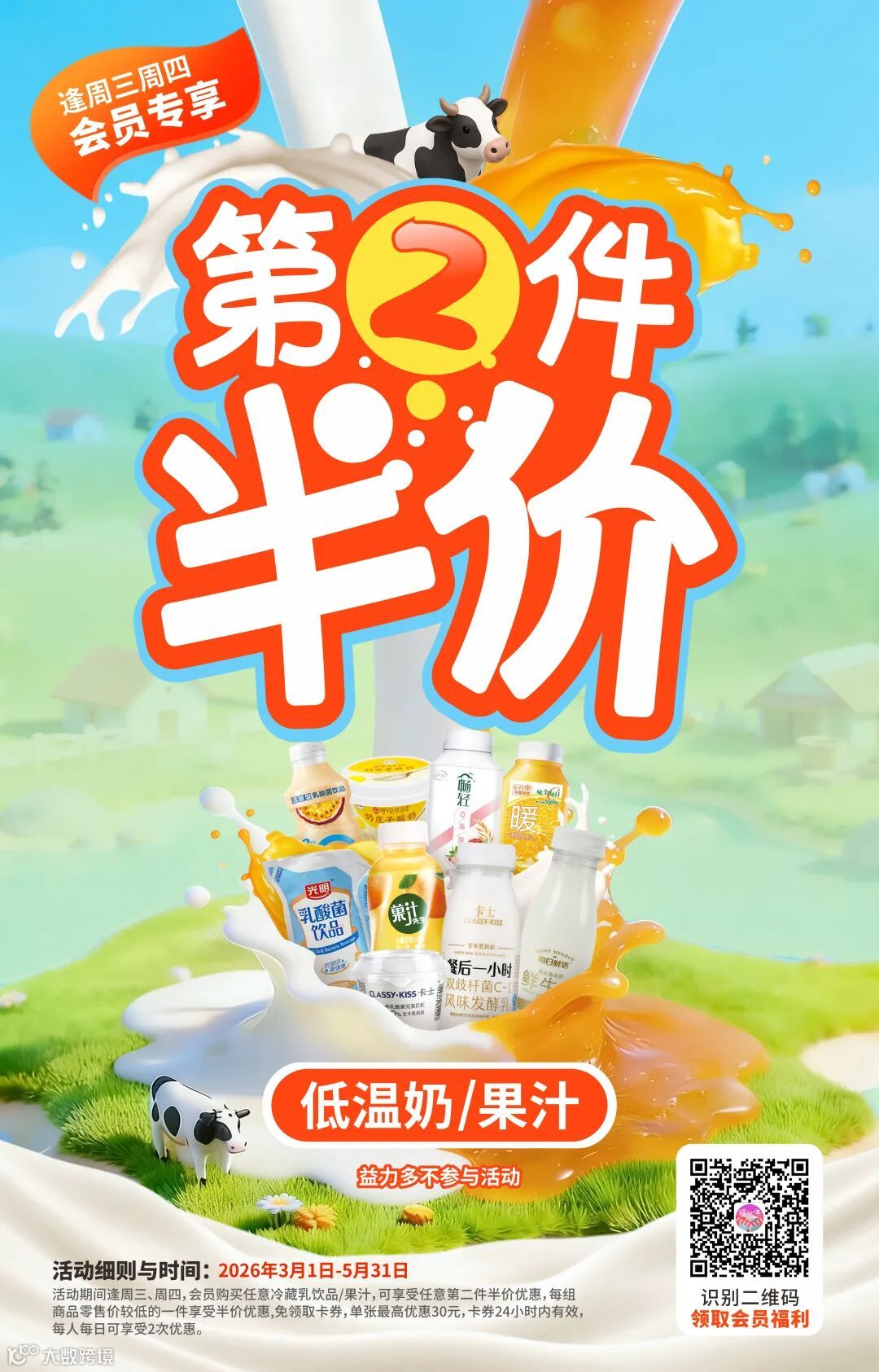 活动期间,逢周三、周四,会员进店购买指定冷藏乳饮品或果汁,即可享受 “第2件半价” 的超值福利!无论是清晨必备的鲜奶,还是午后解渴的果汁,都能让您以更优惠的价格畅享美味。