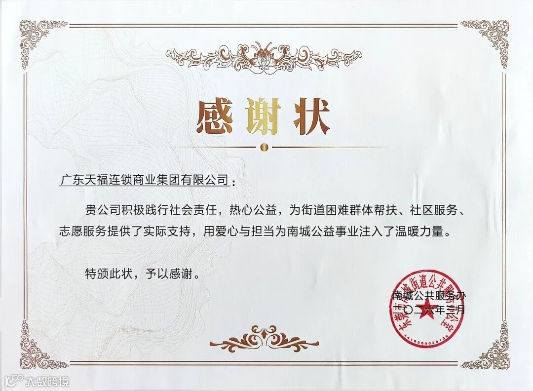 服务民生,载誉前行!天福集团获南城街道致信表彰