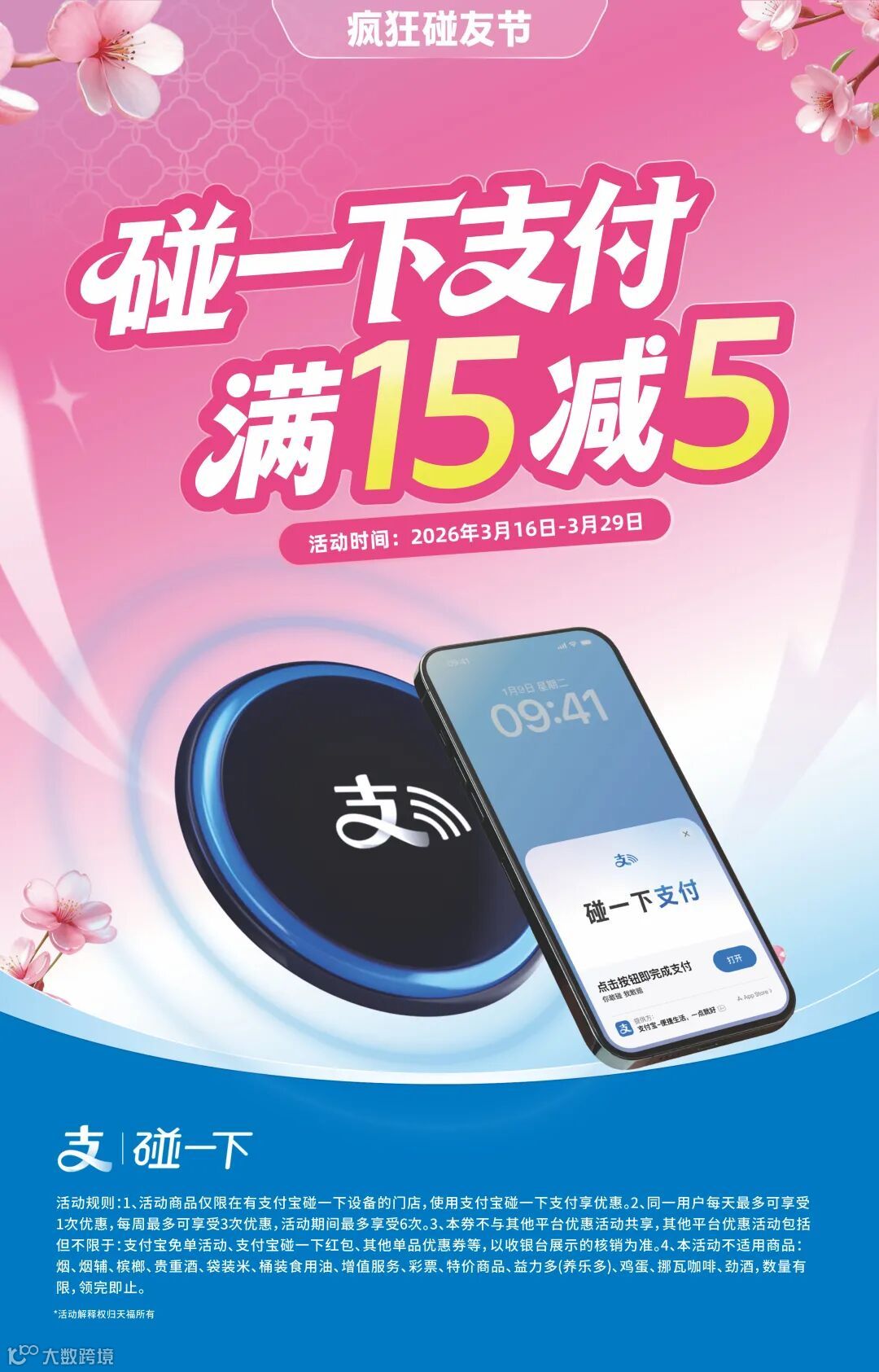 天福联合支付宝推出“疯狂碰友节”主题活动。3月16-29日,消费者在设有支付宝碰一下设备的任意天福门店,使用支付宝“碰一下”支付,即可享受单笔消费满15元立减5元优惠。