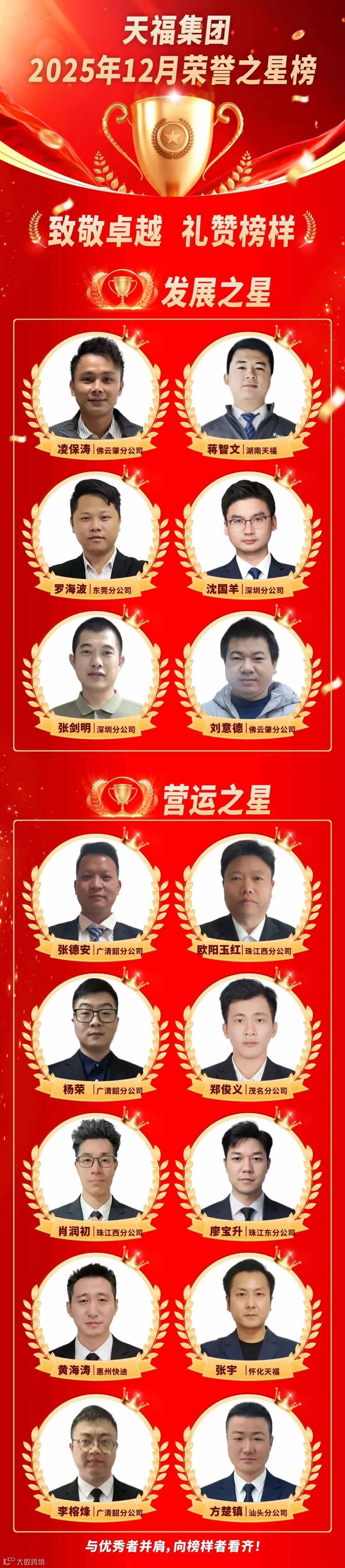 近日,天福集团12月份荣誉之星榜单出炉,为上榜的天福优秀代表点赞!