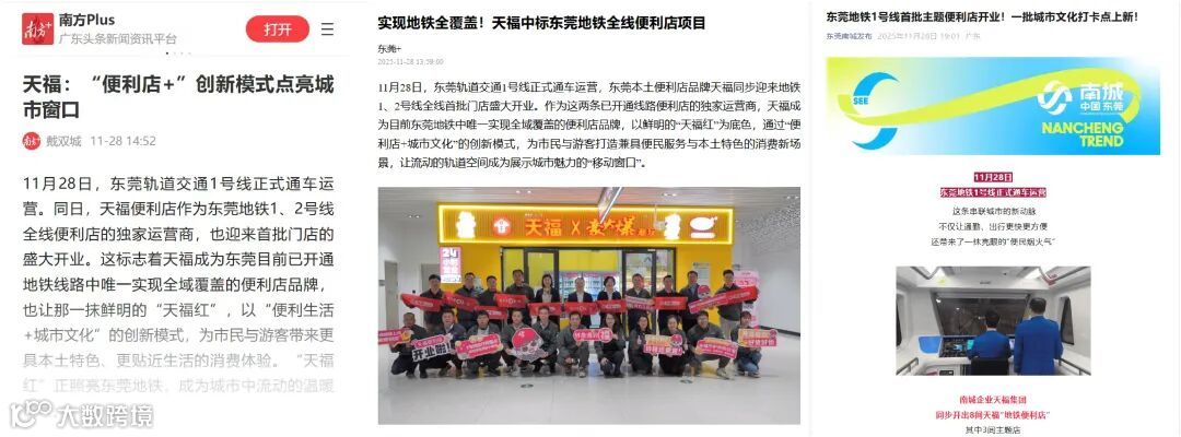 11月28日,天福便利店正式入驻东莞地铁1号线,其首批门店的亮相获得了社会各界的广泛赞誉,以及包括南方日报、东莞日报、东莞南城发布等权威媒体的集中报道。