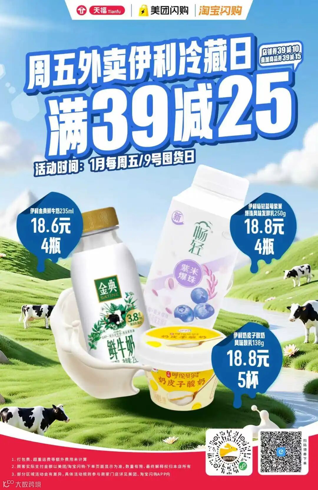 9号外卖囤货日及1月每周五,在美团、淘宝闪购平台下单伊利冷藏商品,即可享受“满39减25”超值优惠,轻松购、安心送,将新鲜与实惠同步送达消费者手中。此次活动精选伊利旗下多款人气冷藏乳品,活动期间每周五准时上线,方便消费者每周定期补货,畅享健康饮奶生活。