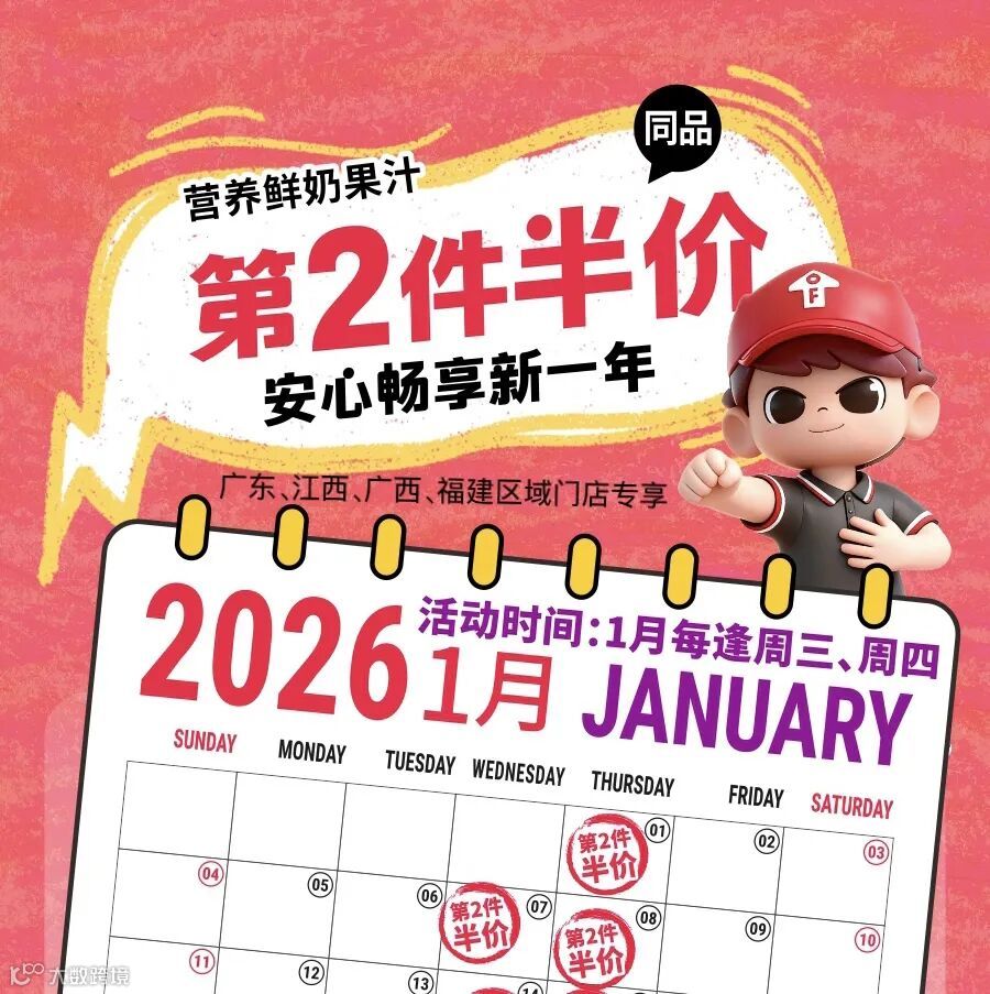 1月每周三周四,顾客选购指定低温奶系列商品时,即可享受同品第二件半价优惠,单次购物轻松实现加量不加价,满足家庭饮用及日常储备需求。欢迎广大顾客前往身边的天福门店,以更优价格选购心仪低温奶产品,为日常健康加分,乐享新鲜美味生活。