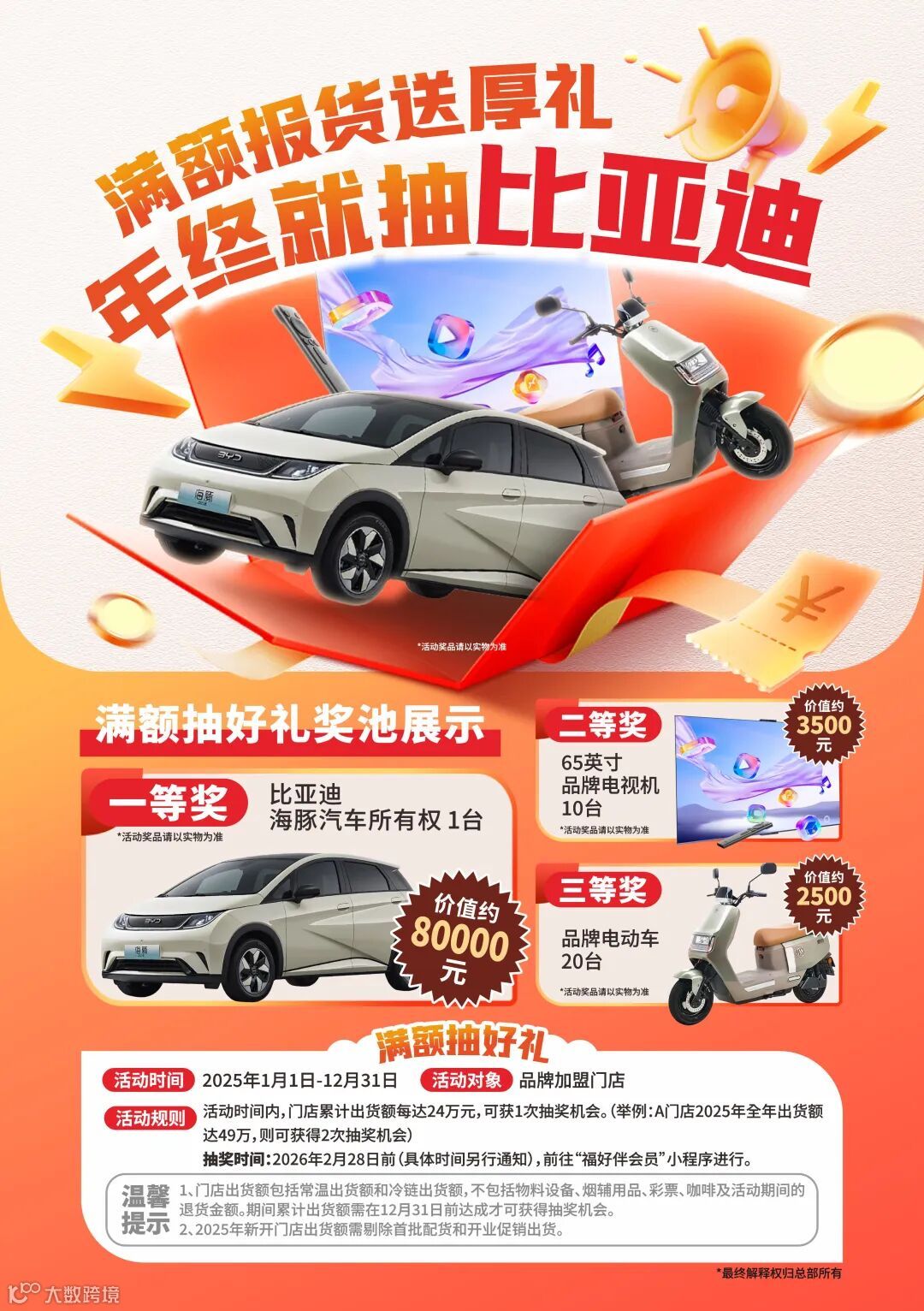 活动期间,门店累计出货额每满24万元即可获得1次抽奖机会,多报多抽!重磅奖品包括:比亚迪汽车1台、65英寸品牌电视机10台、品牌电动车20台!