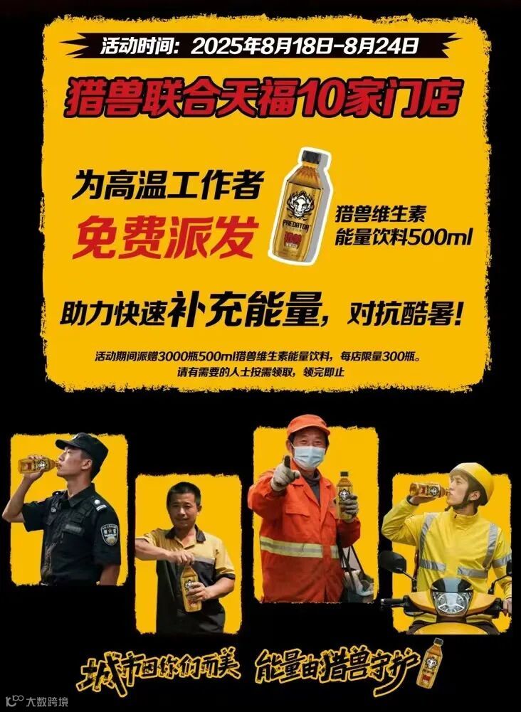 为致敬户外劳动者的辛勤付出,天福便利店携手猎兽品牌发起“0元派送,为高温工作者送上清凉能量”公益活动。活动将于8月18日至24日开展,覆盖东莞10家天福门店,为环卫工人、外卖骑手、建筑工人、司机等高温作业人群免费提供猎兽饮料,助力他们消暑解渴、补充能量。