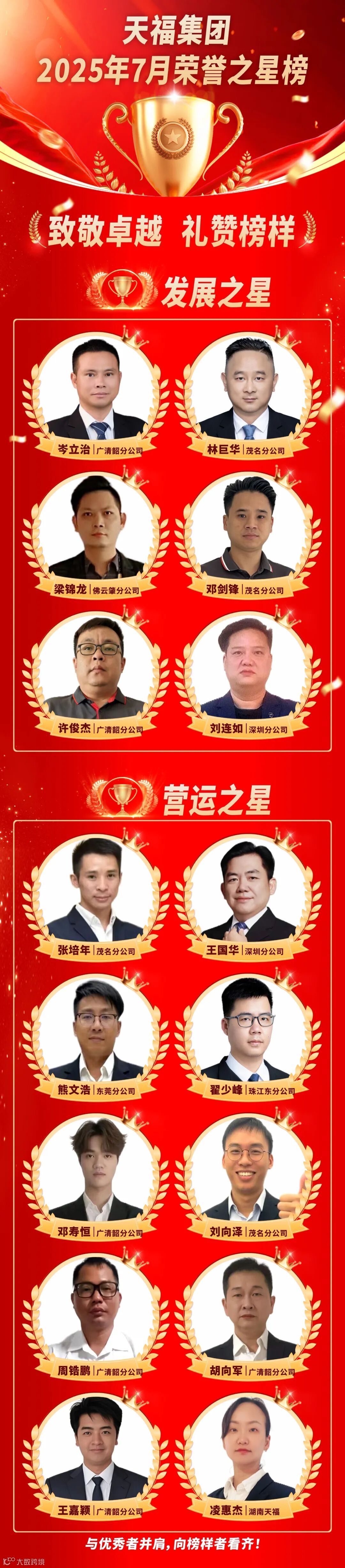 为表彰先进、树立标杆,集团近日公布了发展团队和营运团队2025年7月"荣誉之星"评选结果。经过严格考核与综合评定,共有16名优秀员工脱颖而出,他们以出色的业绩表现和卓越的团队贡献获此殊荣。