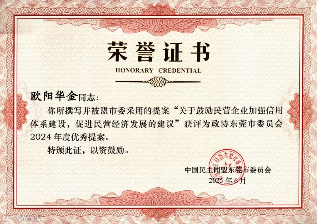 会议对盟市委2024-2025年度参政议政工作进行了总结,表彰了2024-2025年度获奖及获采用提案(建议、信息、材料)的撰稿人。欧阳华金董事长“关于鼓励民营企业加强信用体系建设,促进民营经济发展的建议”提案,获评为政协东莞市委员会2024年度优秀提案。