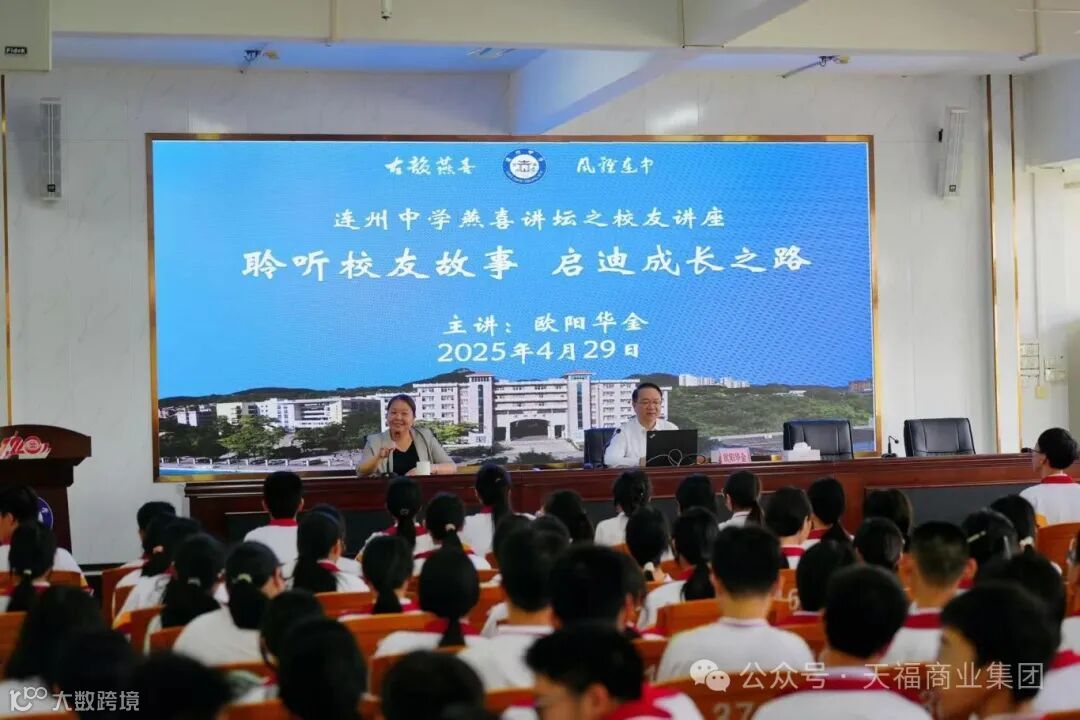 2025年4月29日上午,连州中学图书馆三楼会议室内座无虚席,一场以“聆听校友故事 启迪成长之路”为主题的燕喜讲坛在此隆重举行。天福集团董事长、连州中学校友会会长欧阳华金先生作为杰出校友代表重返母校,以“奋斗人生与家国情怀”为主题,为燕喜学子奉上一场思想盛宴,他们用亲身经历诠释了青春与使命的交响。
