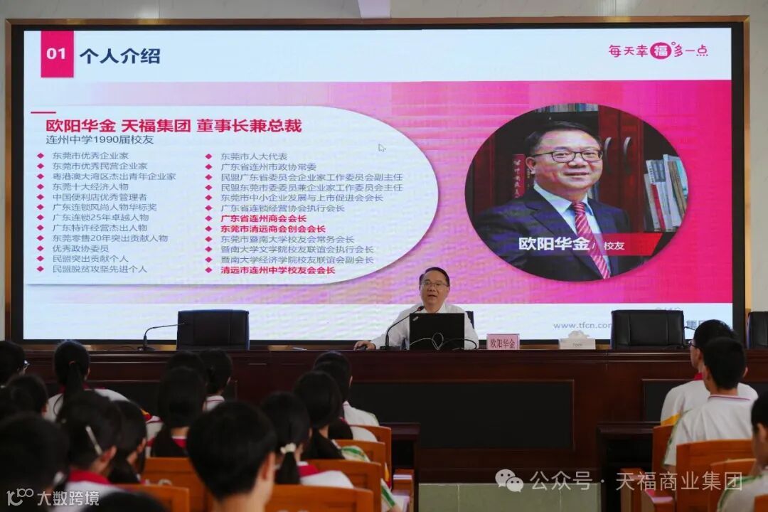 上午9时10分,董事长欧阳华金在连州中学高一高二学子的掌声中步入会场。作为连州中学1990届校友,他以“奋斗人生与家国情怀”为题,将个人创业历程与家国担当进行深度融合,分享了自己从求学、职业到创业的精彩历程。