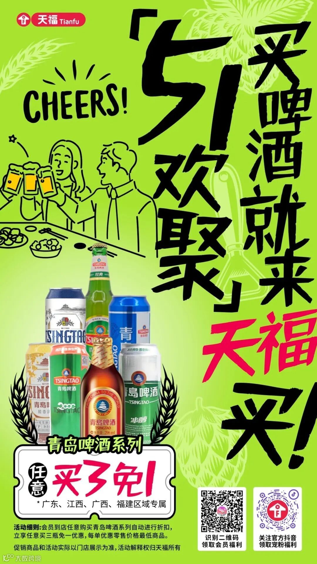 为回馈会员顾客,提升消费体验,天福便利店携手青岛啤酒推出五月青岛啤酒节促销活动!即日起至5月31日,参与门店推出青岛啤酒买三免一超值优惠,会员顾客购买任意三瓶青岛啤酒系列产品,立享免单一瓶,冰爽畅饮更划算!