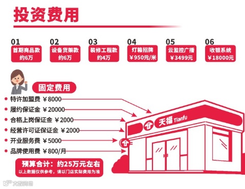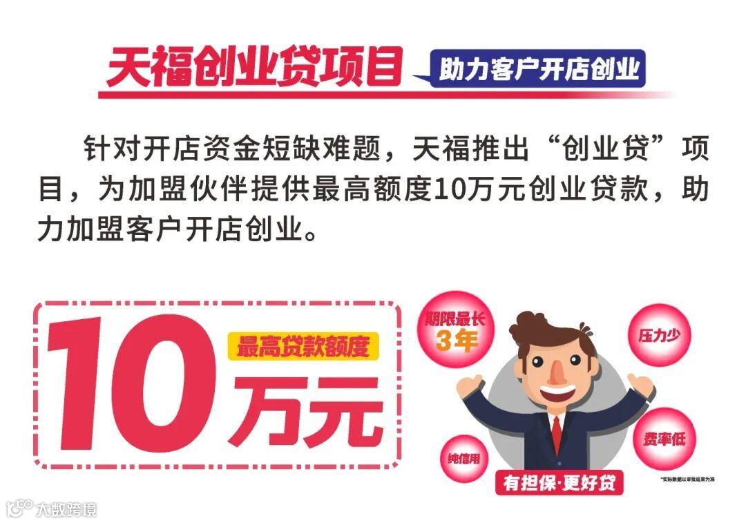 针对资金暂时不足的加盟商,天福推出创业贷项目,为加盟伙伴提供最高额度10万元的创业贷款。