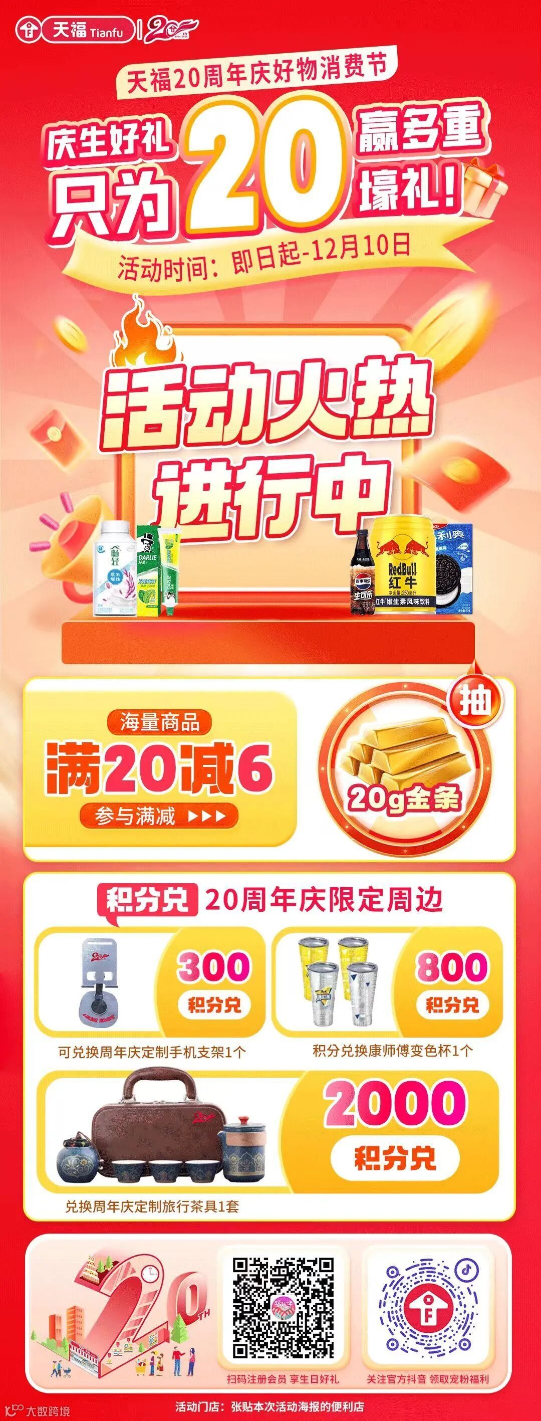活动期间,天福推出“海量商品满20-6”、“5大爆品全年优选价”、“20元购次卡”等6大活动。同时,会员顾客在活动期间可参加积分可兑换周年庆精美礼品。此外,惊喜与福利集结,天福会员消费就有机会抽20克金条。