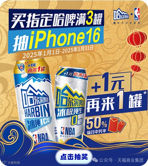 1月1日—31日,注册福好伴会员,在天福门店购买指定数量的哈尔滨啤酒有机会抽奖获得手机、球服等惊喜好物。