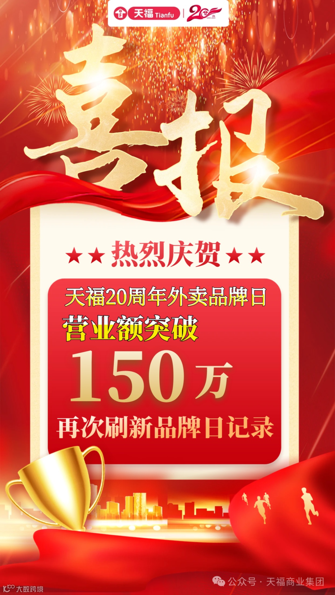天福集团成立二十周年之际,集团开展二十周年美团外卖品牌日系列活动。11月9日外卖品牌日反响热烈,营业额首次突破150万,成功创造外卖品牌日营业额历史新高!