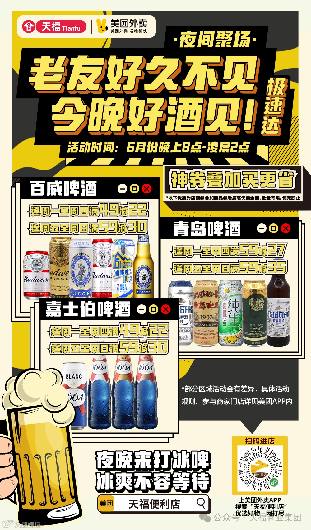 盛夏已至,为迎合消费热点,提升门店销售,天福联合美团开展夜间外卖啤酒促销活动。