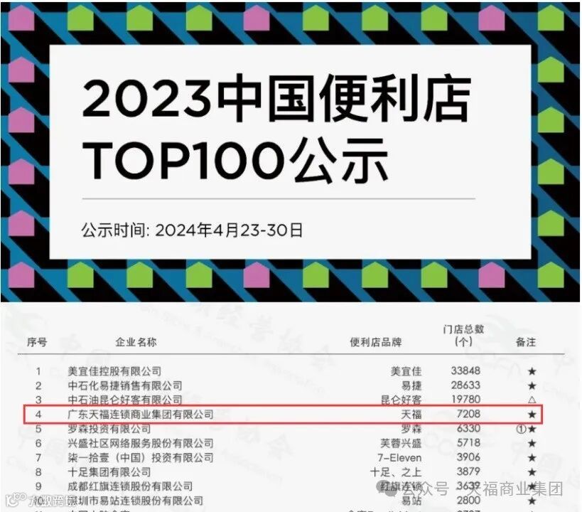 在忙碌且充实的第二季度,天福集团喜讯频传。4月23日,中国连锁经营协会公布《2023中国便利店TOP100》榜单。天福集团以7208家的门店规模位居全国第4。