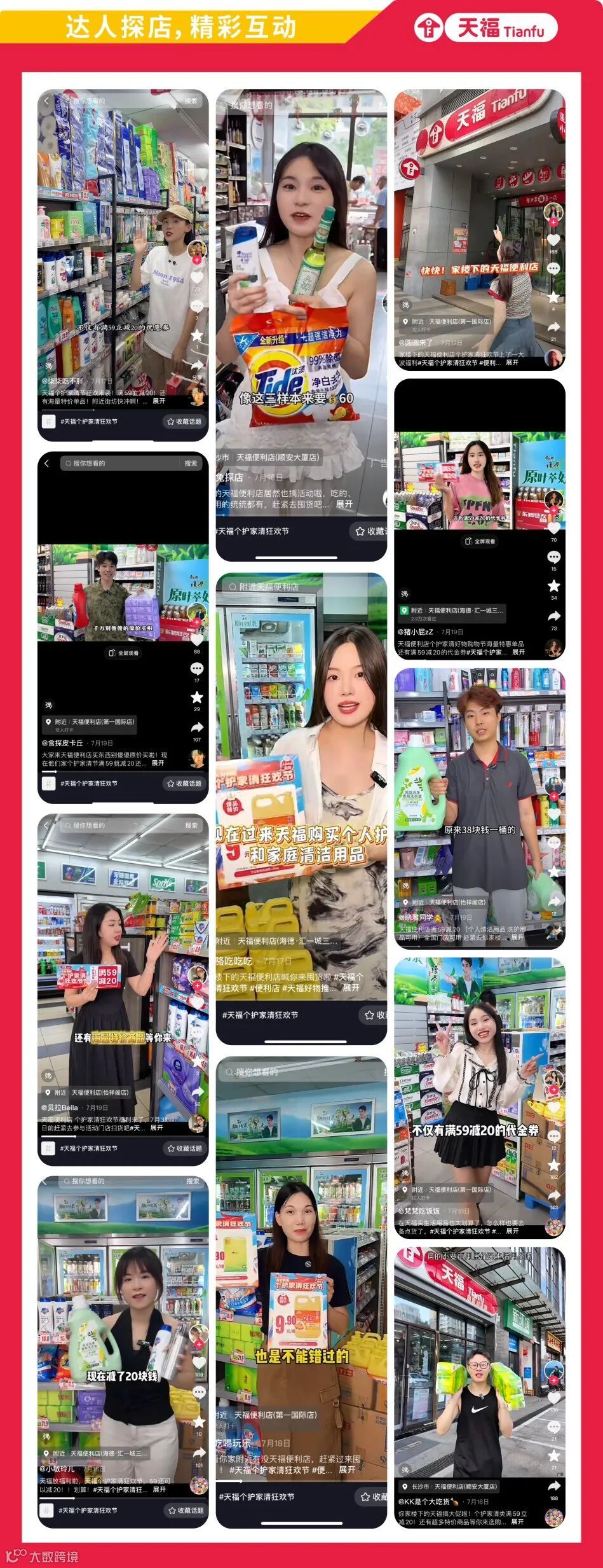 基于用户消费需求和行业趋势洞察,为提升品牌曝光率,扩大个护家清狂欢节促销活动的宣传力度,天福线上携手广东、湖南地区众多抖音达人、KOL,以探店形式开启全民曝光,为广大网友直击家清节火爆现场。