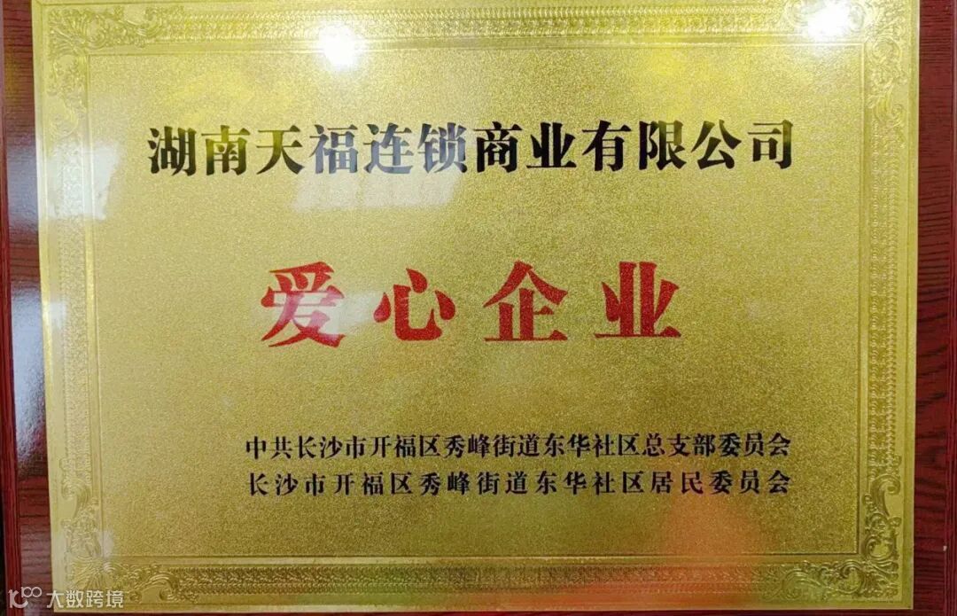 近日,湖南天福荣获长沙市开福区秀峰街道东华社区总支部委员会授予的“爱心企业”荣誉称号。这一殊荣是对湖南天福在社会公益事业中的突出贡献和爱心行动的高度肯定。