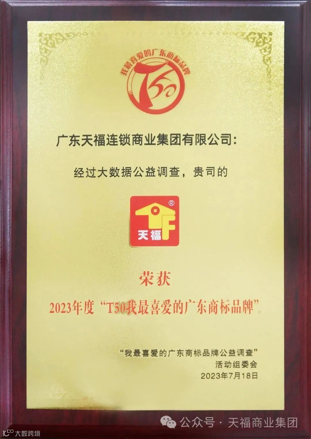 天福荣获2023年度“T50我最喜爱的广东商标品牌”奖项