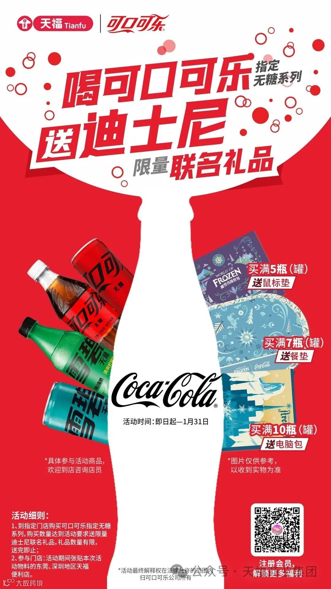 即日起至1月31日,消费者在指定天福门店购买可口可乐无糖系列产品,将有机会获得迪士尼联名电脑包、鼠标垫等精美礼品。