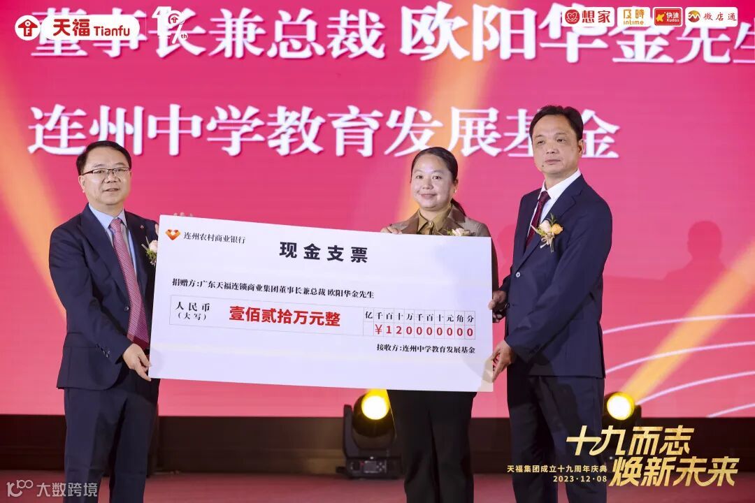 在这场备受瞩目的庆典中,同步举行了连州中学教育发展基金捐赠仪式。连州中学校友会第一届理事会会长、集团董事长兼总裁欧阳华金先生现场宣布,为支持母校连州中学的教育发展,向连州中学教育发展基金捐赠120万人民币,以庆祝母校120岁生日。
