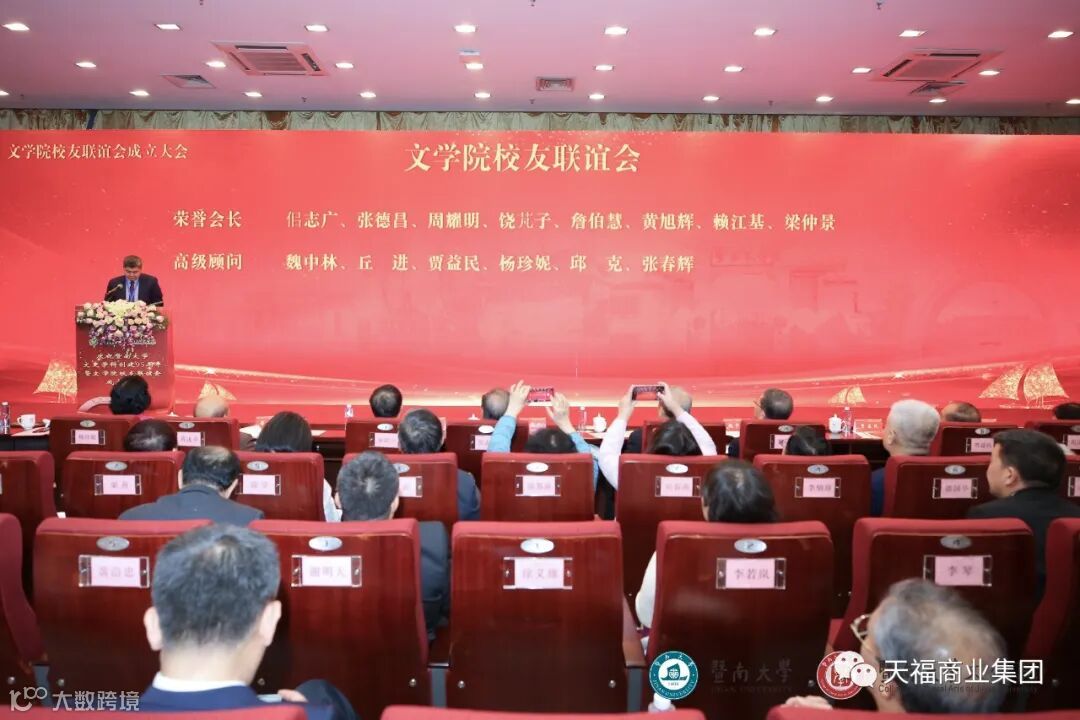 会上隆重举行了暨南大学文学院校友联谊会成立庆典仪式,佀志广、张德昌、周耀明、饶芃子、詹伯慧、黄旭辉、赖江基、梁仲景被聘为荣誉会长,魏中林、丘进、贾益民、杨珍妮、邱克、张春辉被聘为高级顾问,纪宗安教授当选会长,欧阳华金董事长当选执行会长。
