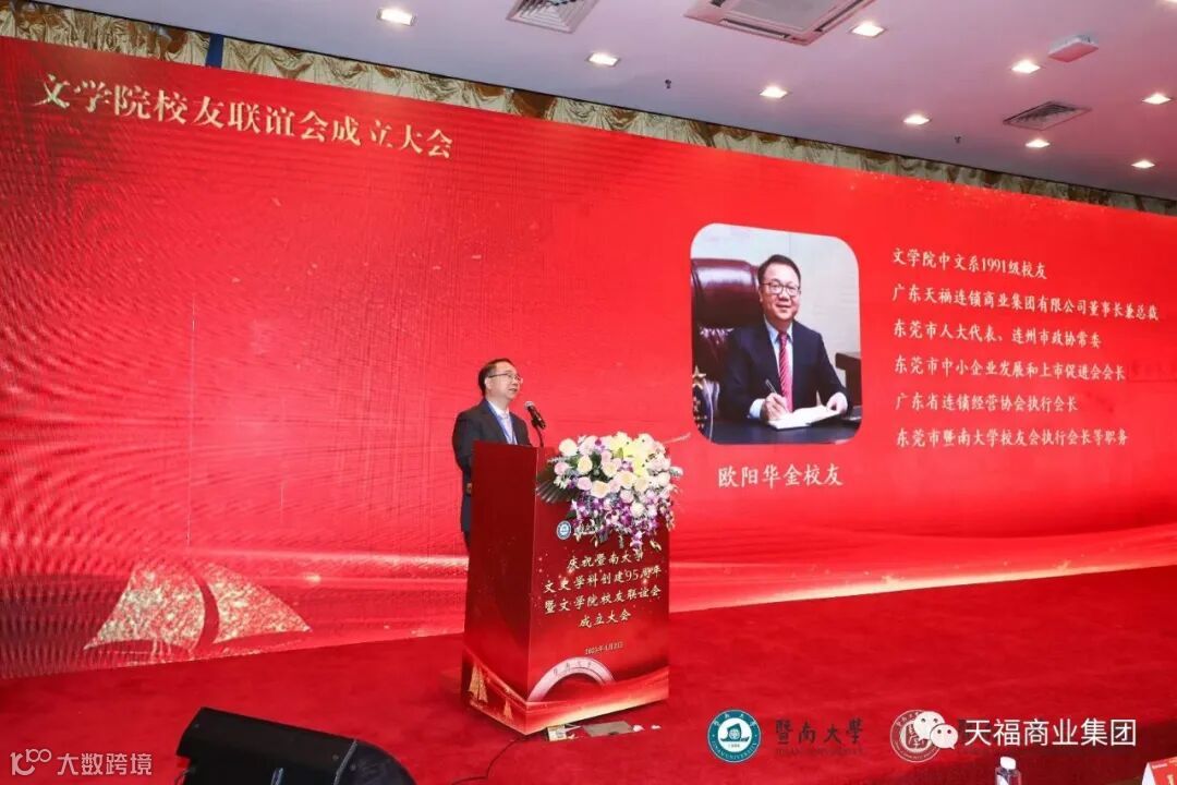 4月2日,暨南大学文史学科创建95周年暨文学院校友联谊会成立庆典大会在暨南大学(石牌校区)曾宪梓科学馆二楼国际会议厅隆重召开。历届校友代表以及学校师生等欢聚一堂,盛况空前。东莞市暨南大学校友会执行会长、天福集团董事长兼总裁欧阳华金,受邀出席了本次大会。