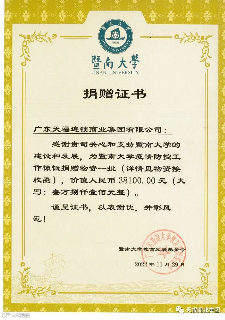 天福本次的爱心捐赠,不仅是对“忠信笃敬”校训的传承践行,更是对教育事业和公益事业的热忱和奉献。未来,天福集团将一如既往为公益事业贡献力量,积极履行企业的社会责任,回馈社会各界的信任与支持,为建设和谐社会持续贡献天福力量。