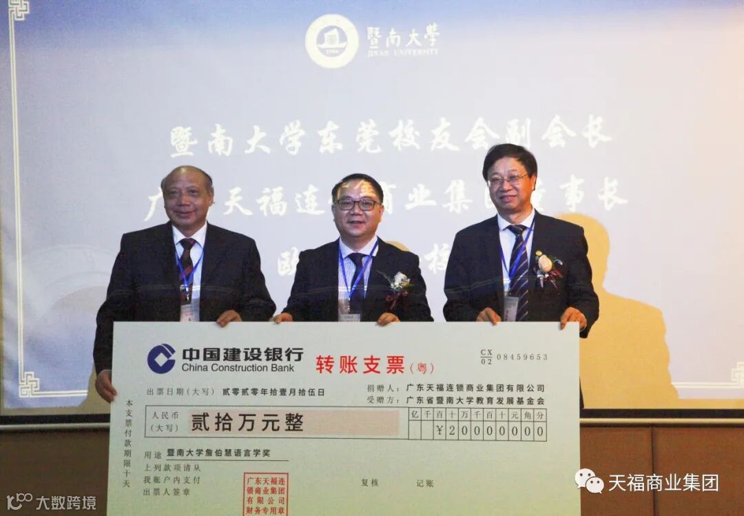 欧阳总领导的天福集团为暨南大学蒙古包重建工程捐赠善款,让新一代暨大学子感受悠久的学校历史和人文精神、向暨南大学教育发展基金会捐赠20万元用于詹伯慧语言学奖,作为南方第一个语言学家,欧阳总以实际行动衷心祝愿语言学奖健康发展。