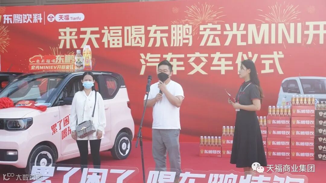 “来天福喝东鹏,宏光MINI开回家”活动是天福集团与东鹏饮料集团共同协作,为广大消费者送上的重磅8月惊喜福利活动,一经开展,便吸引了众多顾客参与。经过两轮直播抽奖,最终张先生、梁女士两位幸运顾客喜中价值5万元的宏光MINI汽车一台,恭喜他们!