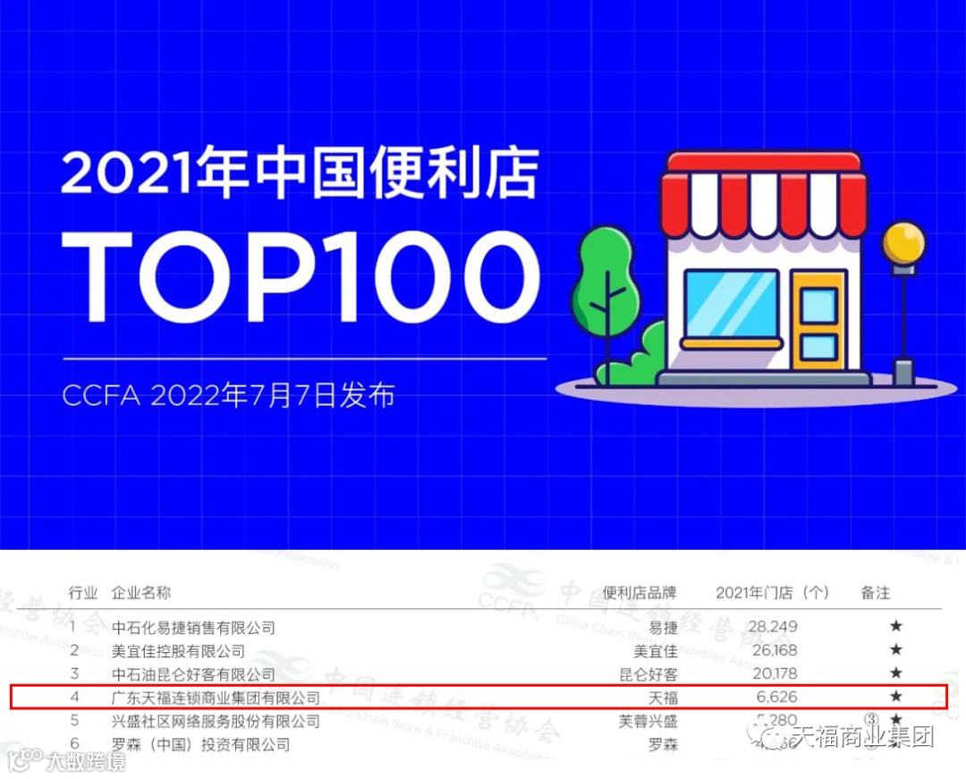 7月7日,中国连锁经营协会(CCFA)发布“2021年中国便利店TOP100”榜单,天福集团凭借高速的发展和强大的品牌影响力,以6626间的门店数量,荣登全国第四。