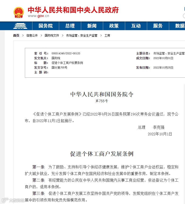 10月25日,国务院正式公布《促进个体工商户发展条例》(下称《条例》),条例自2022年11月1日起施行。