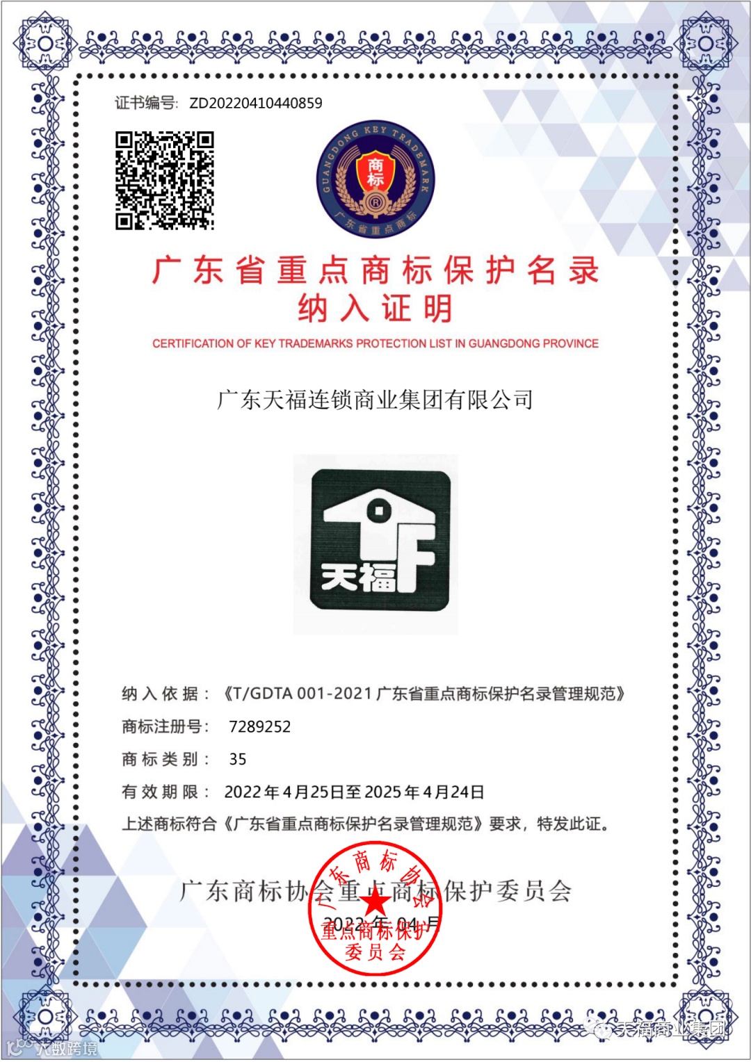 近期,广东商标协会公布《2021年度广东省重点商标保护名录》。经广东商标协会重点商标保护委员会审议通过,广东天福连锁商业集团旗下“天福”商标成功入选,品牌实力再获权威认证,集团品牌建设工作迈向新台阶。