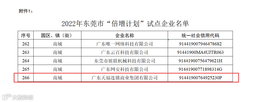 近日,东莞市倍增办发布了《关于2022年东莞市“倍增计划”企业名单的公示》,确定了1021家试点倍增和协同倍增企业,天福集团成功入选2022年东莞市“倍增计划”试点企业,公司发展再获政府肯定和政策鼓励,未来发展前景广阔。