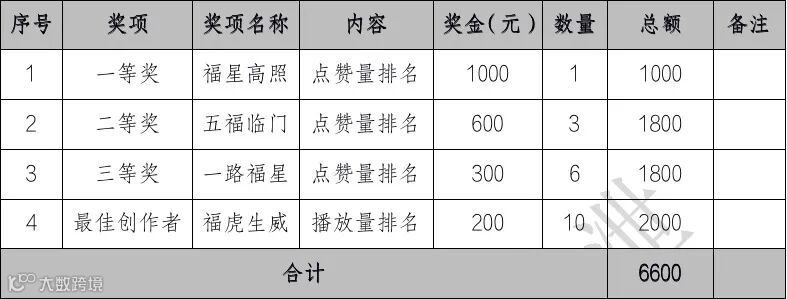 注意:视频总播放量达两万,方可入围“一等奖”评选;视频总播放量达一万,方可入围“二等奖”评选;视频总播放量达伍仟,方可入围“三等奖”评选。