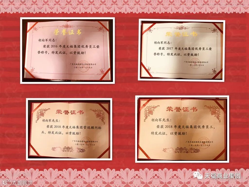 四年荣获“优秀员工”称号,胡向军在平凡的岗位上创造了不平凡的成绩。他用每一滴汗水和每一份付出,生动地诠释了天福“诚信、团结、创新、拼搏”的企业精神,以实际行动践行了使命,他是当之无愧的“天福铁军”。