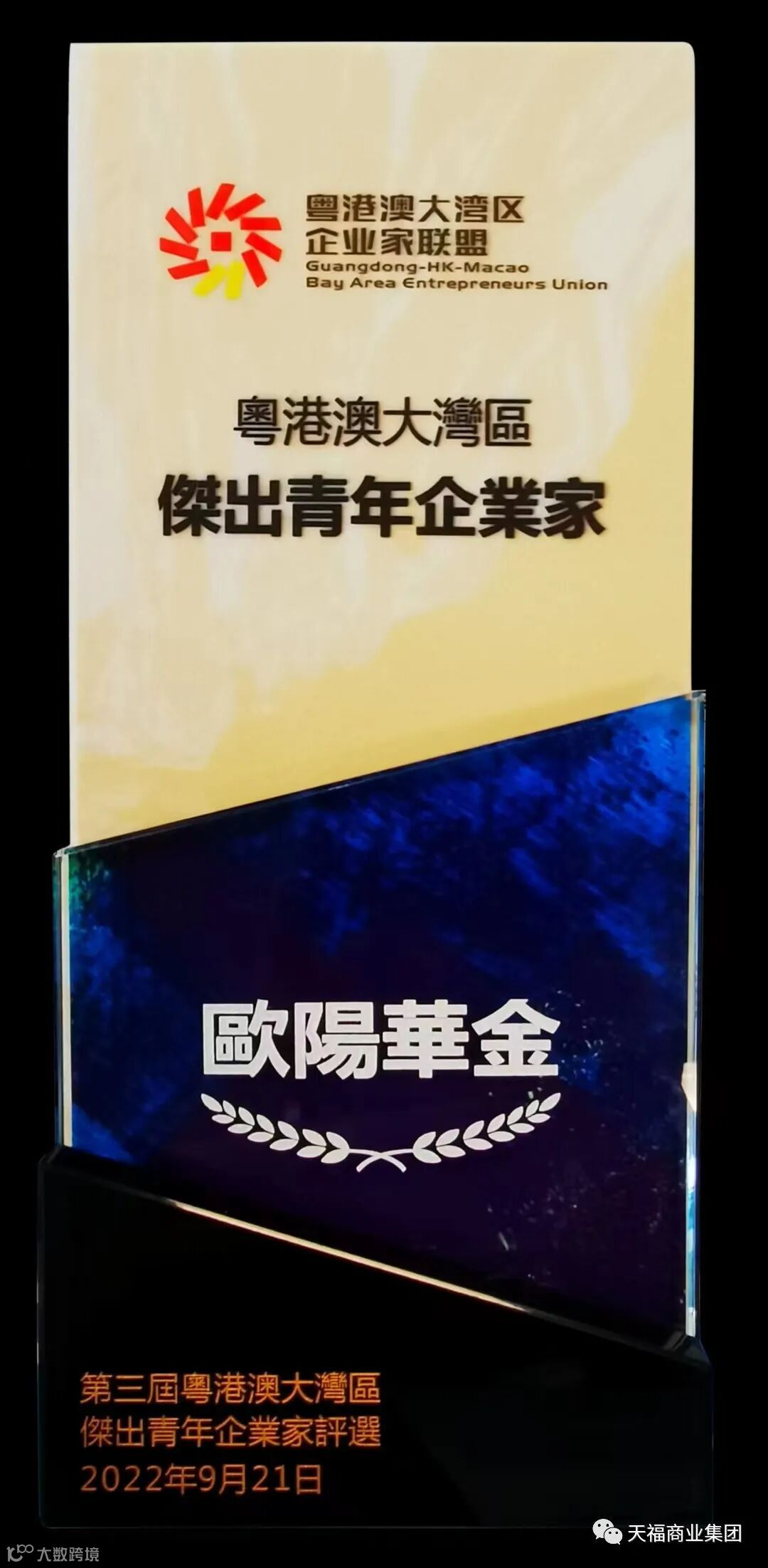 此次当选“粤港澳大湾区杰出青年企业家”,是对欧阳华金董事长卓越商业才华的高度认可,同时也是对其领导的天福集团多年发展成果的充分肯定。展望未来,天福集团将在欧阳华金董事长的带领下,聚焦创新主业,抢抓发展机遇,勇于担当作为,积极投身大湾区建设发展,以昂扬的奋斗姿态在国家发展大局中谱写集团辉煌发展新篇章!